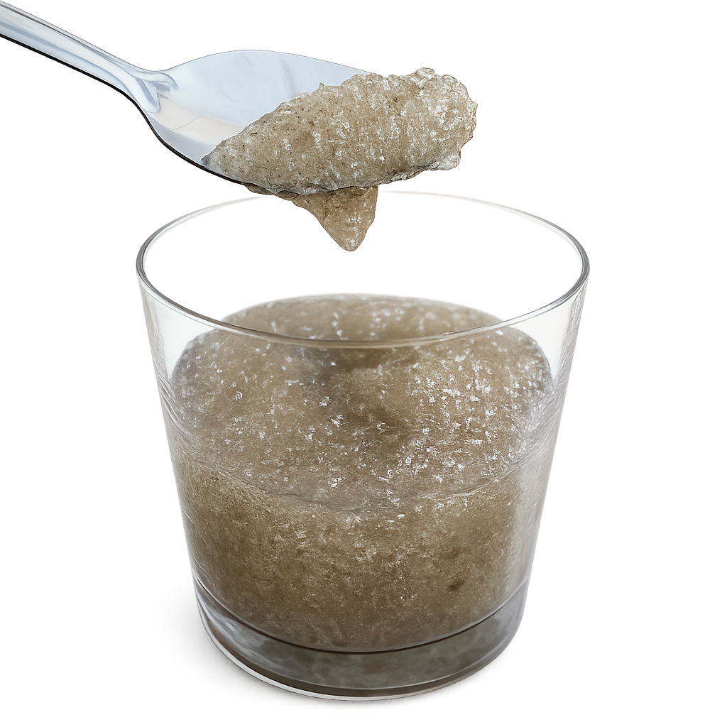 Within approximately one minute, the tablet expands and the mixture turns into a dense gel. Dark brown humate particles are also visible.